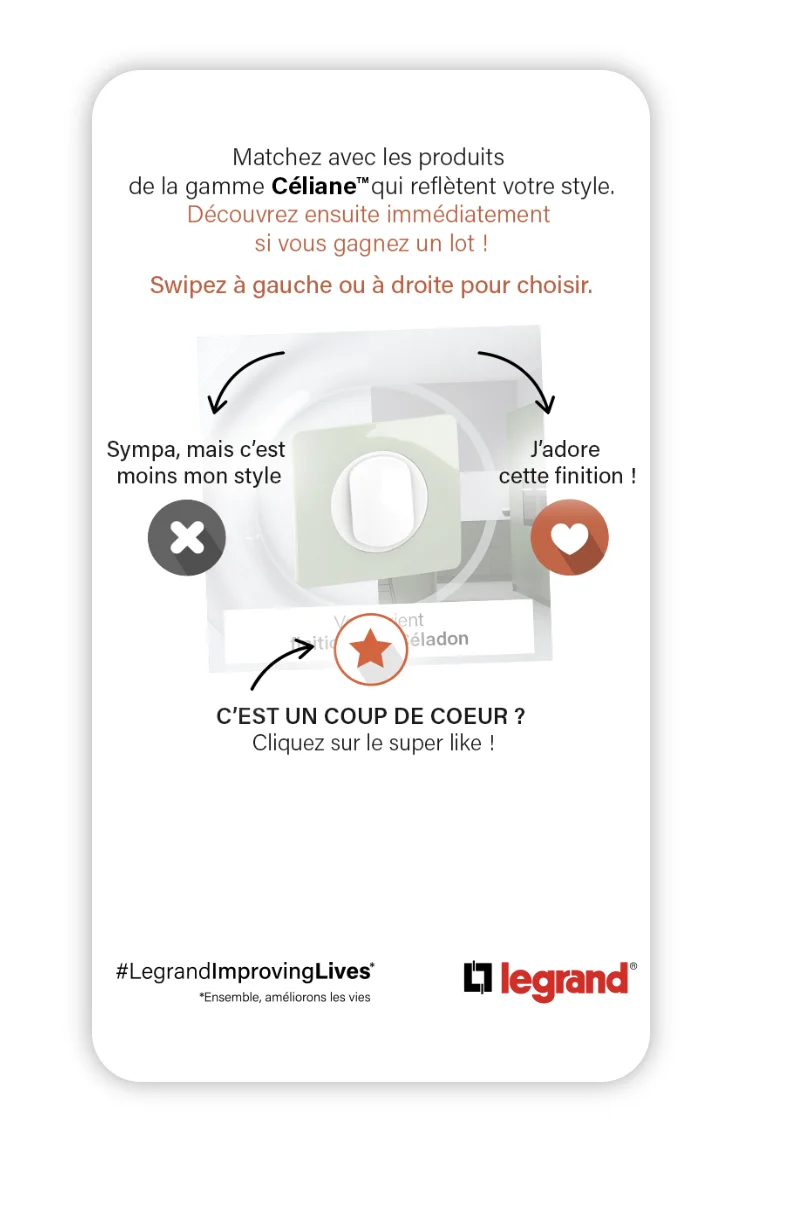 Exemple : Une enseigne peut analyser l’historique d’achat de ses clients pour identifier leurs styles préférés. En fonction de ces insights, elle leur enverra des recommandations. C’est ce qu’a fait l’enseigne Legrand avec son opération pour la marque Céliane. Grâce à la mécanique interactive Swiper, Legrand a pu récolter plus de 115 000 préférences clients.
